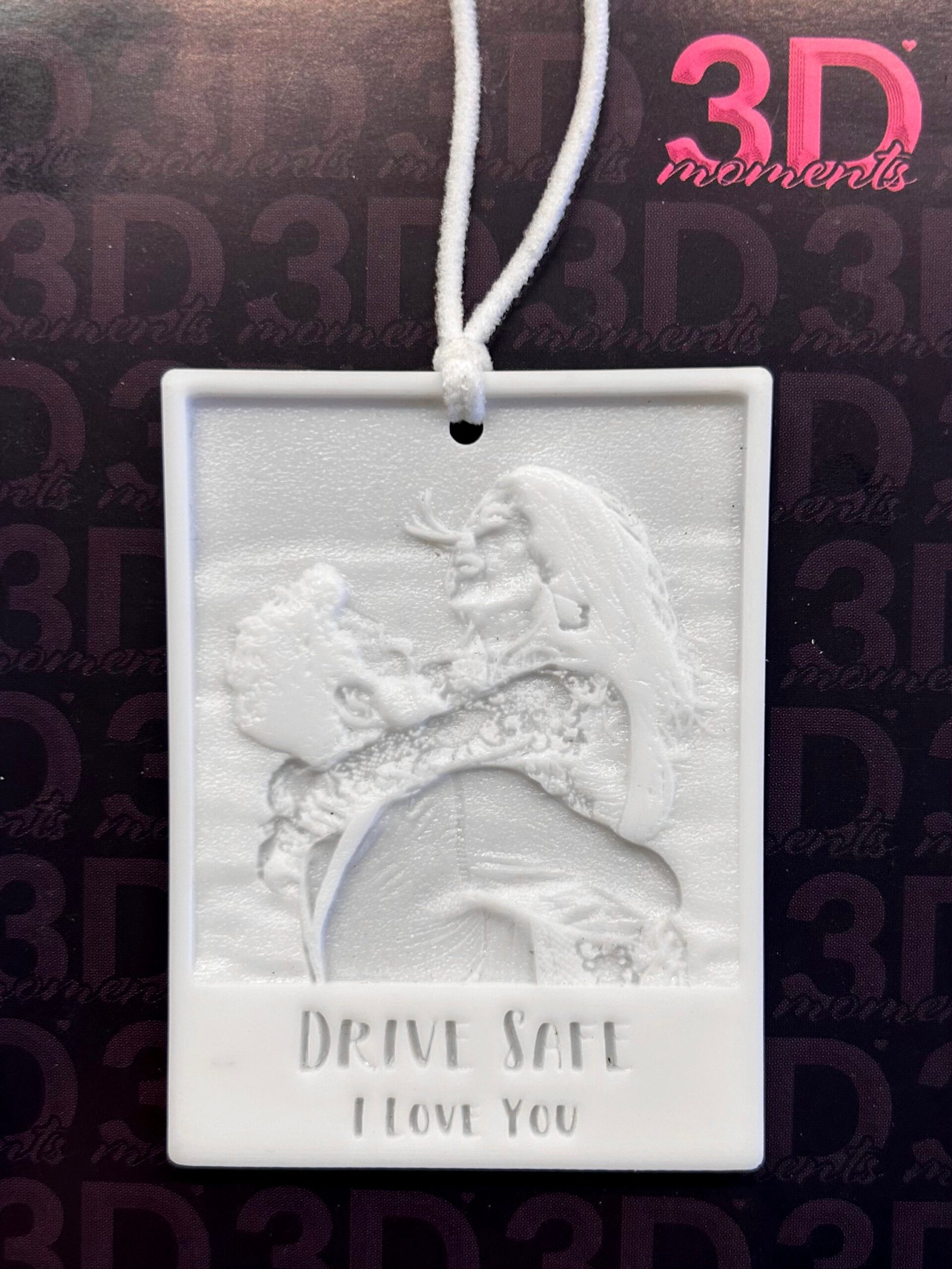 Our 3D Photo Ornaments work like magic, we create a 3D relief of your photo and print it using the latest in 3Dprinting technology. When you put it up on it in your car it will catch the light to reveal your photo.