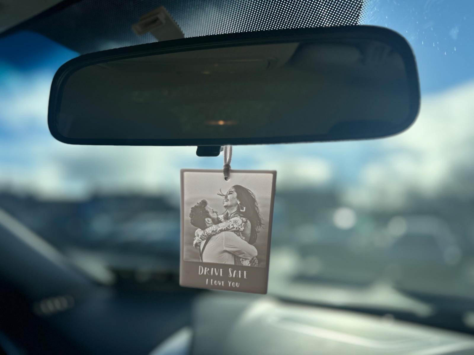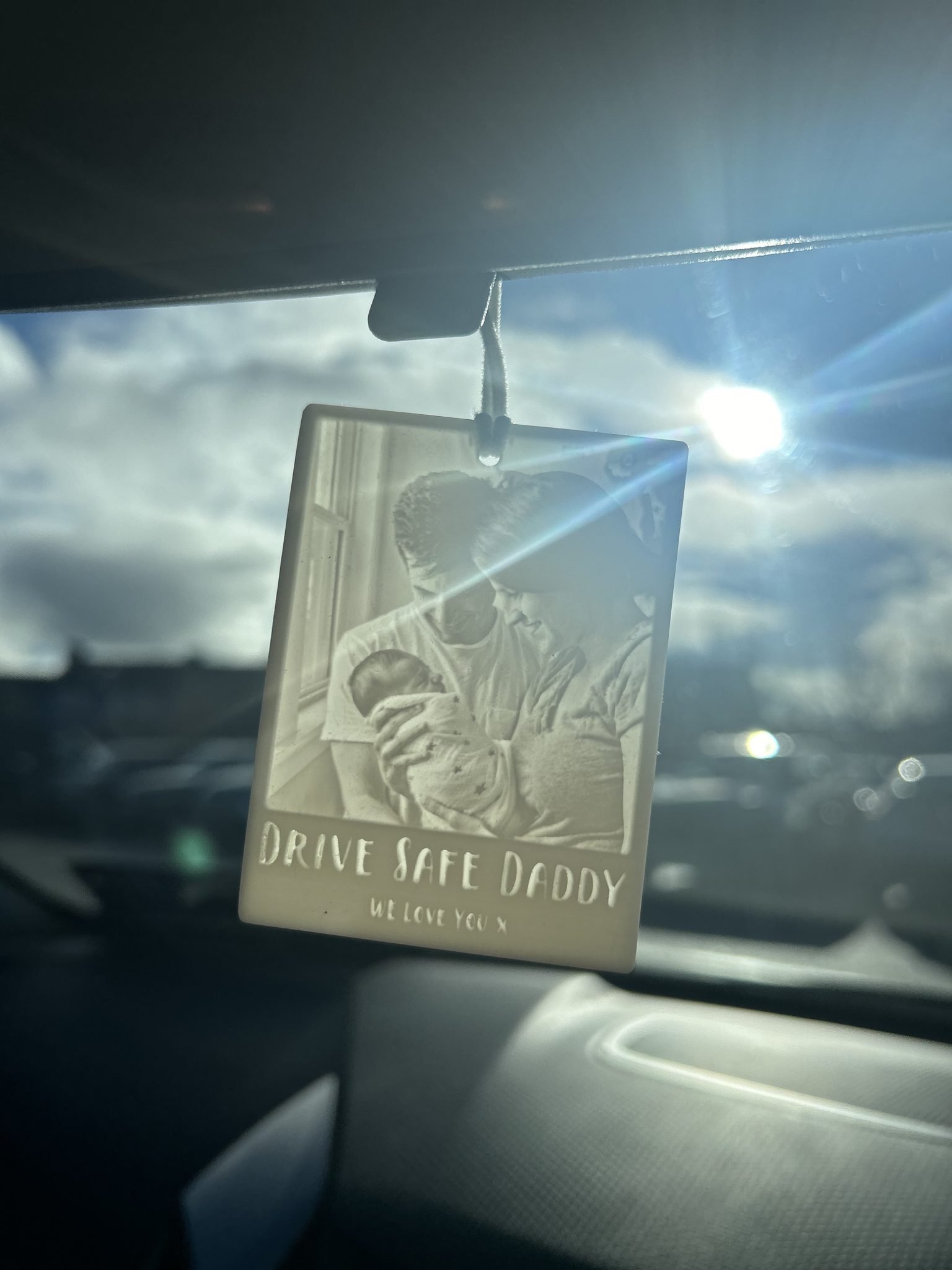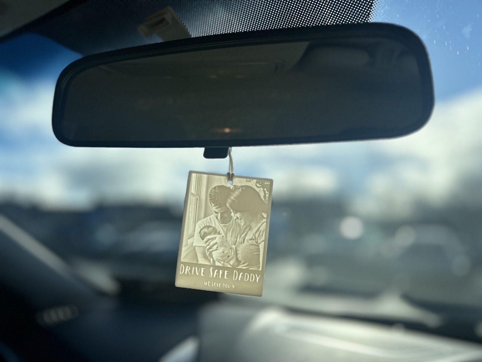 The 3D Photo ornament comes on an elasticated loop for easy hanging to your rearview mirror.