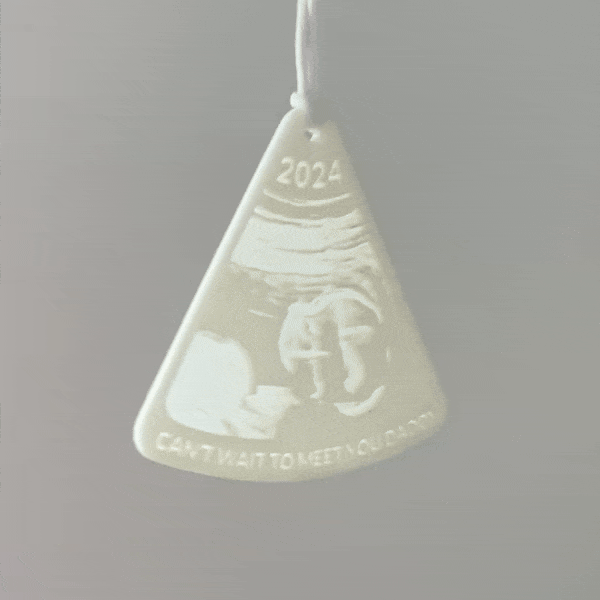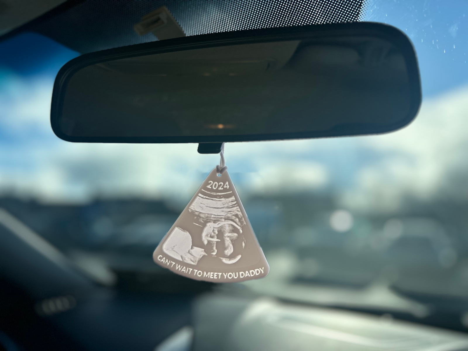 Our 3D Ultrasound Ornaments work like magic, we create a 3D relief of your photo and print it using the latest in 3Dprinting technology. When you put it up on it in your car it will catch the light to reveal your photo.