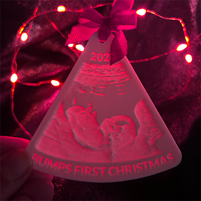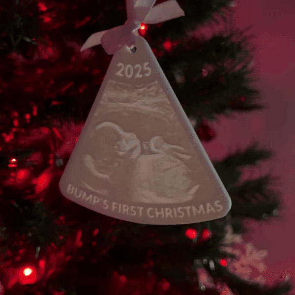 Using advanced 3D printing technology, we create an ornament that’s more than just a decoration – it’s a cherished memory. When you hold it against the light (or catches the glow from your Christmas tree lights) the intricate details of your baby bump come to life, turning this piece into a truly magical keepsake for the festive season.